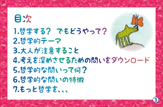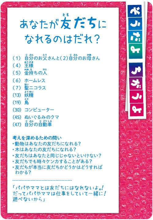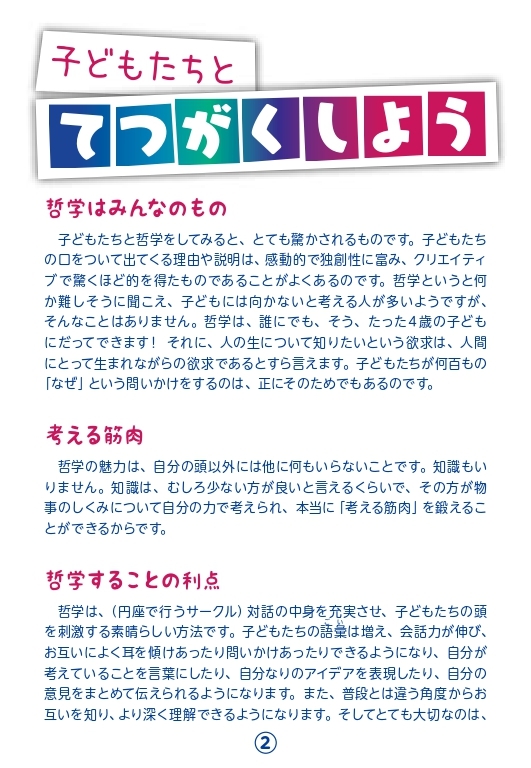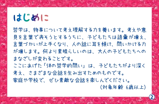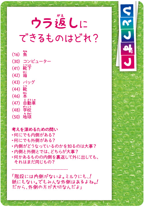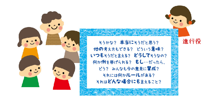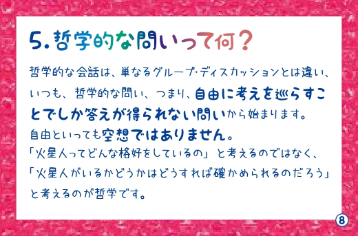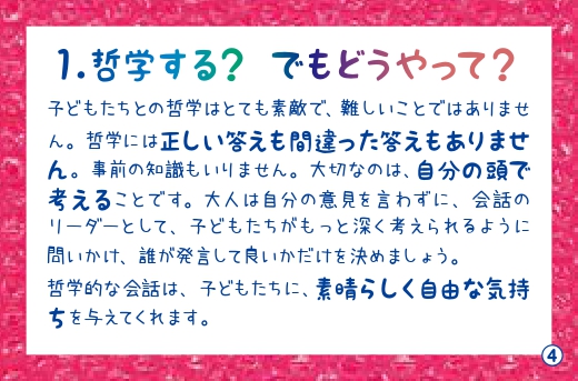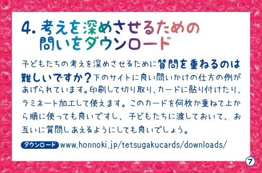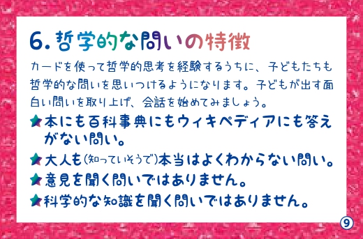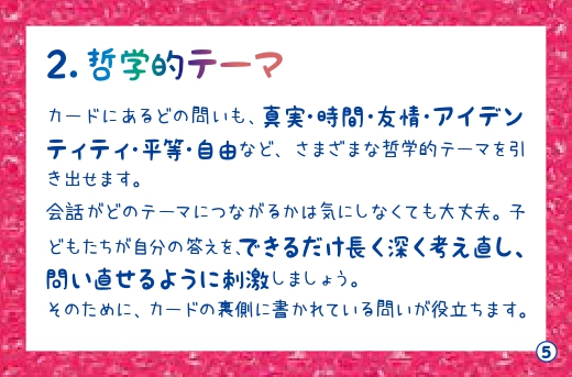 子どもたち同士、または子どもたちと大人とが一緒になって哲学するカードです。