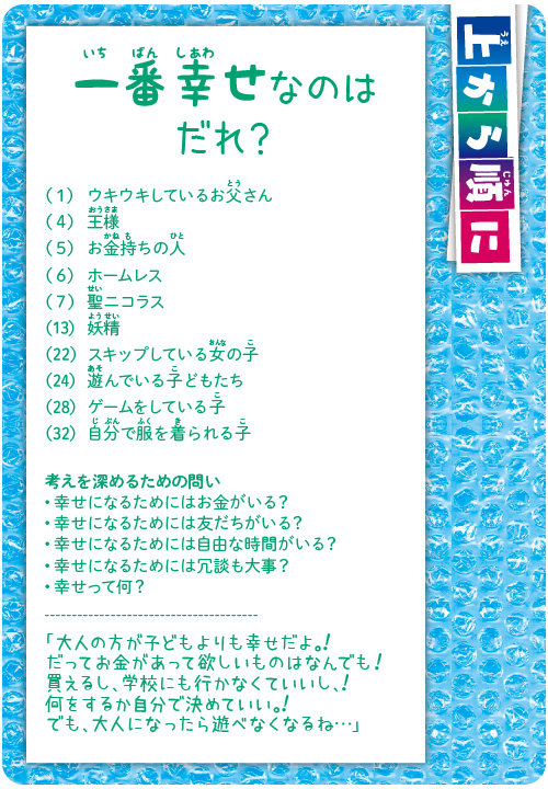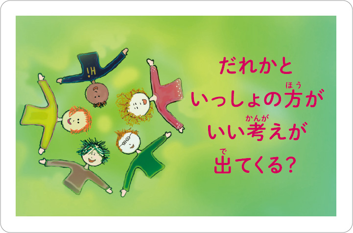訪問中のオランダの小学校で偶然出くわした「てつがく授業」。4歳と5歳の子どもたち10人ほどを円座にして使っていたのがこのカードでした。先生は、写真を見せたり、絵を描かせるなどしながらカードの問いに沿って、子どもたちの言葉を確認していくだけです。そうしているうちに、大人にも思いつかない、本質をついた言葉が子どもたちの口から次々に現れてくる様子に、思わず涙がこみ上げるほど感動しました。