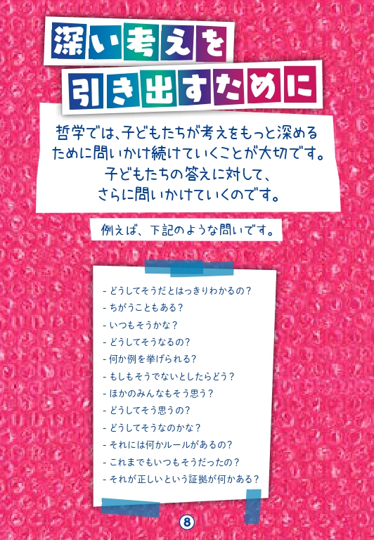 まずは「てつがくおしゃべりカード」や「てつがく絵カード」を使いながら、問いを重ねてみてください。子どもたちの哲学的思考力が高まっていきます。