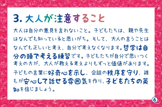 - 大人は問いかけるだけで自分の考えや答えを言わないこと。
